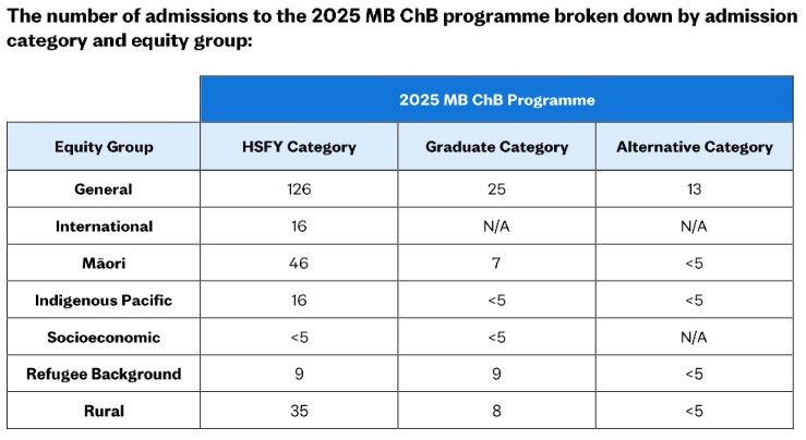 Table 2. Official Information Act request response showing the number of students admitted through each sub-category for MBChB (medicine) at Otago Uni in 2025. Original document can be accessed here