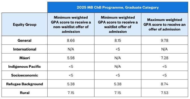 Table 4. Official Information Act request response showing minimum grades to get into Med and Dent via General category HSFY in 2025. Original document can be found here Below are the minimum weighted GPAs required for graduate entry into medicine in 2025: